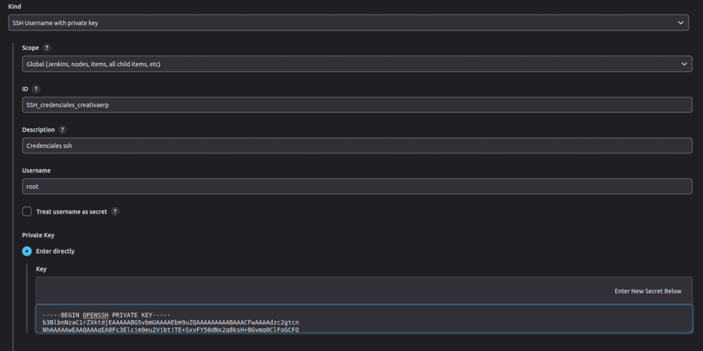 cat ~/.ssh/id_rsaBashAhora ir al administrador de Jenkins y vamos a crear las credenciales de tipo: SSH Username with private key. Aqui pegaremos el contenido de nuestra key privada.