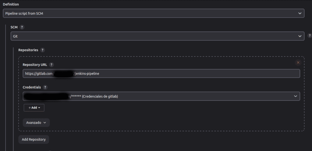 Ahora configuraremos una area de tipo pipeline con la url del repositorio y las credenciales de gitlab creadas en Jenkins