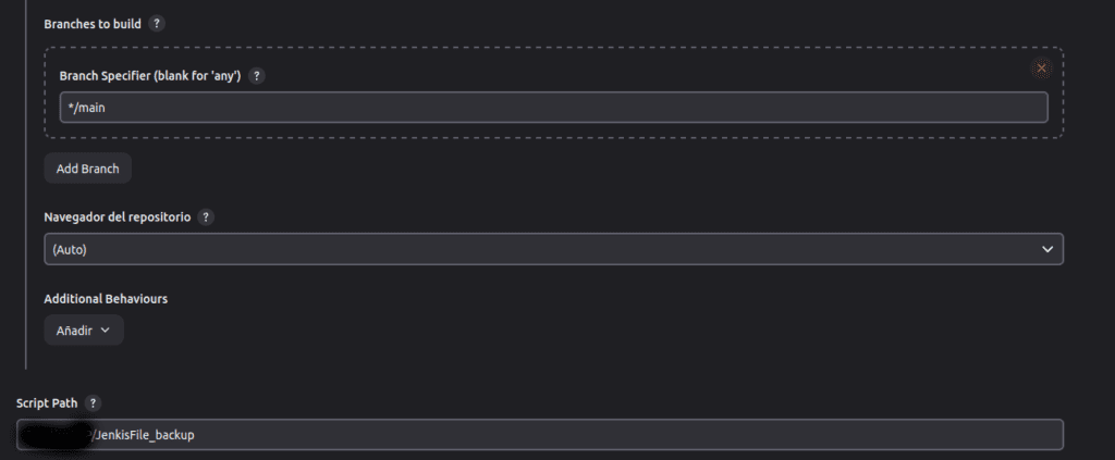 Continuamos configurando la rama del repositorio y la ruta del script jenkinsfile