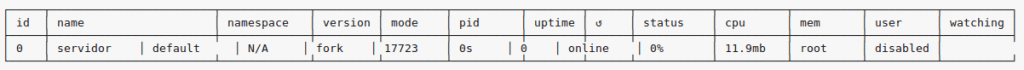 pm2 start servidor.jsShellScriptVeremos la sálida del servicio iniciado con su nombre para su posterior uso con los comandos